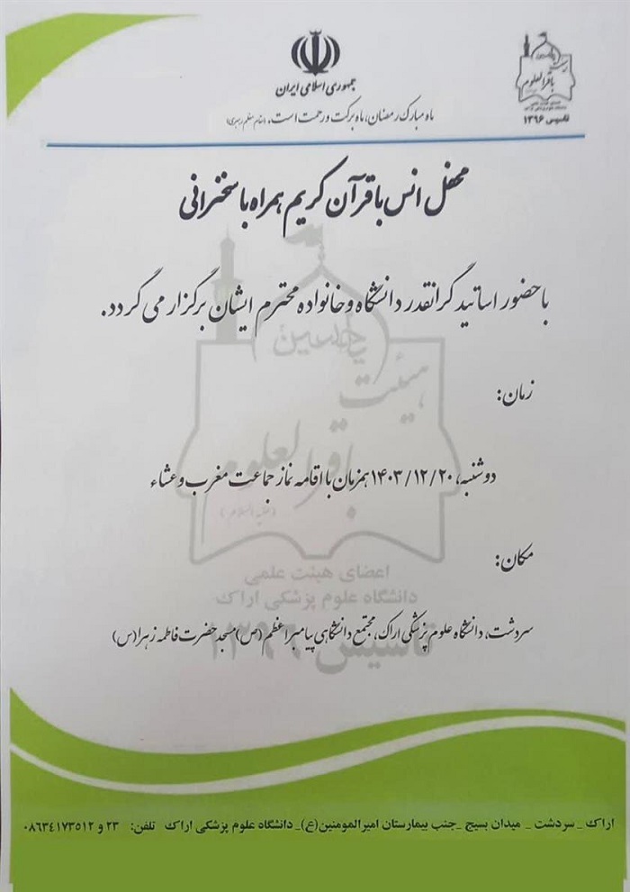 به اطلاع می رساند محفل انس با قرآن کریم هیئت اساتید باقرالعلوم (ع) دانشگاه علوم پزشکی اراک برگزار می گردد.