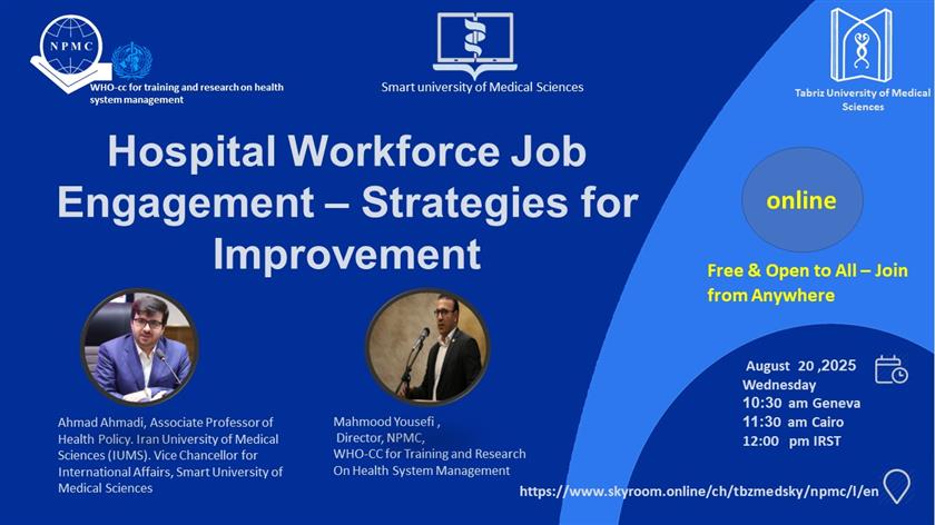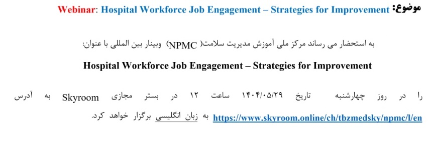 وبینار آموزشی بین المللی Hospital Workforce Job Engagement – Strategies for Improvement ۲۹ مرداد ۱۴۰۴ | ۱۰:۰۱ کد : ۵۳۹۲۵ اطلاعیه ارسال به دیگران نام شما ایمیل شما ایمیل دریافتکننده ارسال انصراف تعداد بازدید:۱۷۸۴ وبینار آموزشی بین المللی Hospital Workforce Job Engagement – Strategies for Improvement