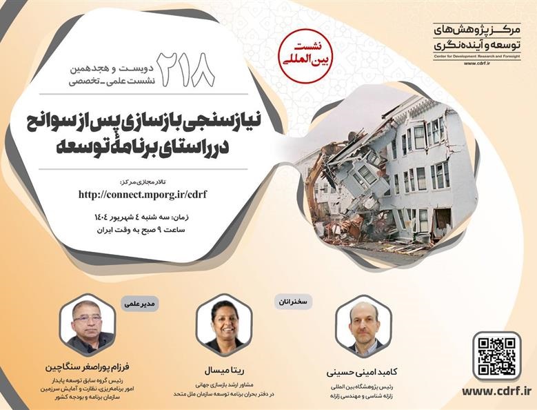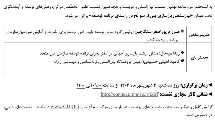 نشست علمی نیاز سنجی بازسازی سوانح در راستای برنامه توسعه ۰۳ شهریور ۱۴۰۴ | ۱۲:۳۷ کد : ۵۴۰۰۰ اطلاعیه ارسال به دیگران نام شما ایمیل شما ایمیل دریافتکننده ارسال انصراف تعداد بازدید:۱۵۹۴ نشست علمی نیاز سنجی بازسازی سوانح در راستای برنامه توسعه، توسط مرکز پژوهش های توسعه و آینده نگری برگزار می گردد.