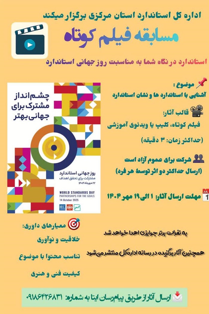 به مناسبت روز جهانی استاندارد و در راستای ترویج فرهنگ استاندارد در جامعه، اداره کل استاندارد استان در نظر دارد مسابقه ای با عنوان " آشنایی با استانداردها و نشان استاندارد " در قالب تولید فیلم کوتاه برگزار نماید.
