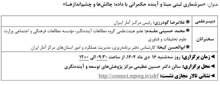 نشست علمی سرشماری ثبتی مبنا آینده حکمرانی با داده ۱۴ دی ۱۴۰۴ | ۱۰:۲۱ کد : ۵۷۴۱۸ اطلاعیه ارسال به دیگران نام شما ایمیل شما ایمیل دریافتکننده ارسال انصراف تعداد بازدید:۹۱۹ دویست وسی وهفتمین نشست علمی - تخصصی با عنوان سرشماری ثبتی مبنا آینده حکمرانی با داده، چالش ها وچشم اندازها